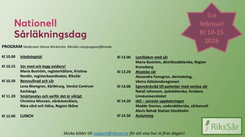 Varje år bjuder RiskSår in till en digital Nationell Sårläkningsdag med ett härligt och fullspäckat program. Många uppskattade och spännande föreläsare. Årets Sårläkningsdag kommer att äga rum torsdag 5 februari 2026. Det kommer att bjudas på en härlig dag med föreläsningar med mycket information och inspiration.
